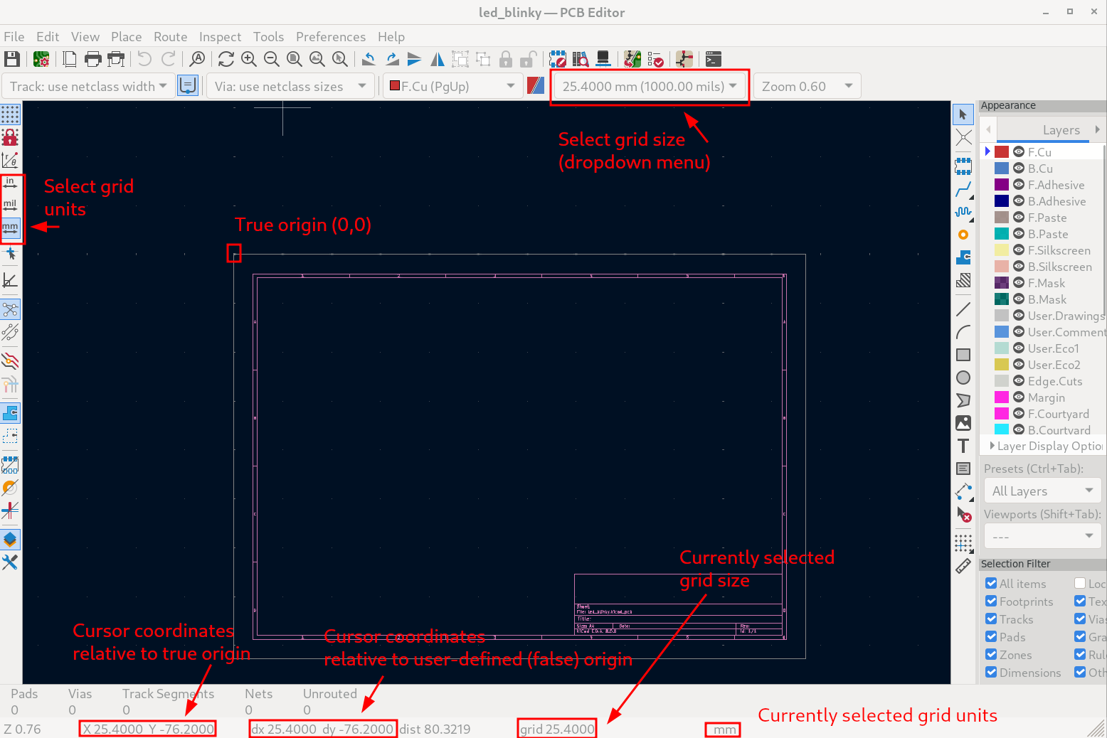 The cursor coordinates can be determined by looking at the bottom status bar. The X/Y coordinates are defined with respect to the top left corner of the white outline defining the work area. The second set of coordinates; dx/dy, are defined with respect to a user-defined/false origin. This false origin can be set anywhere in the work area simply by moving the cursor there and pressing space bar. The false origin will come in very handy when sizing the PCB outline.