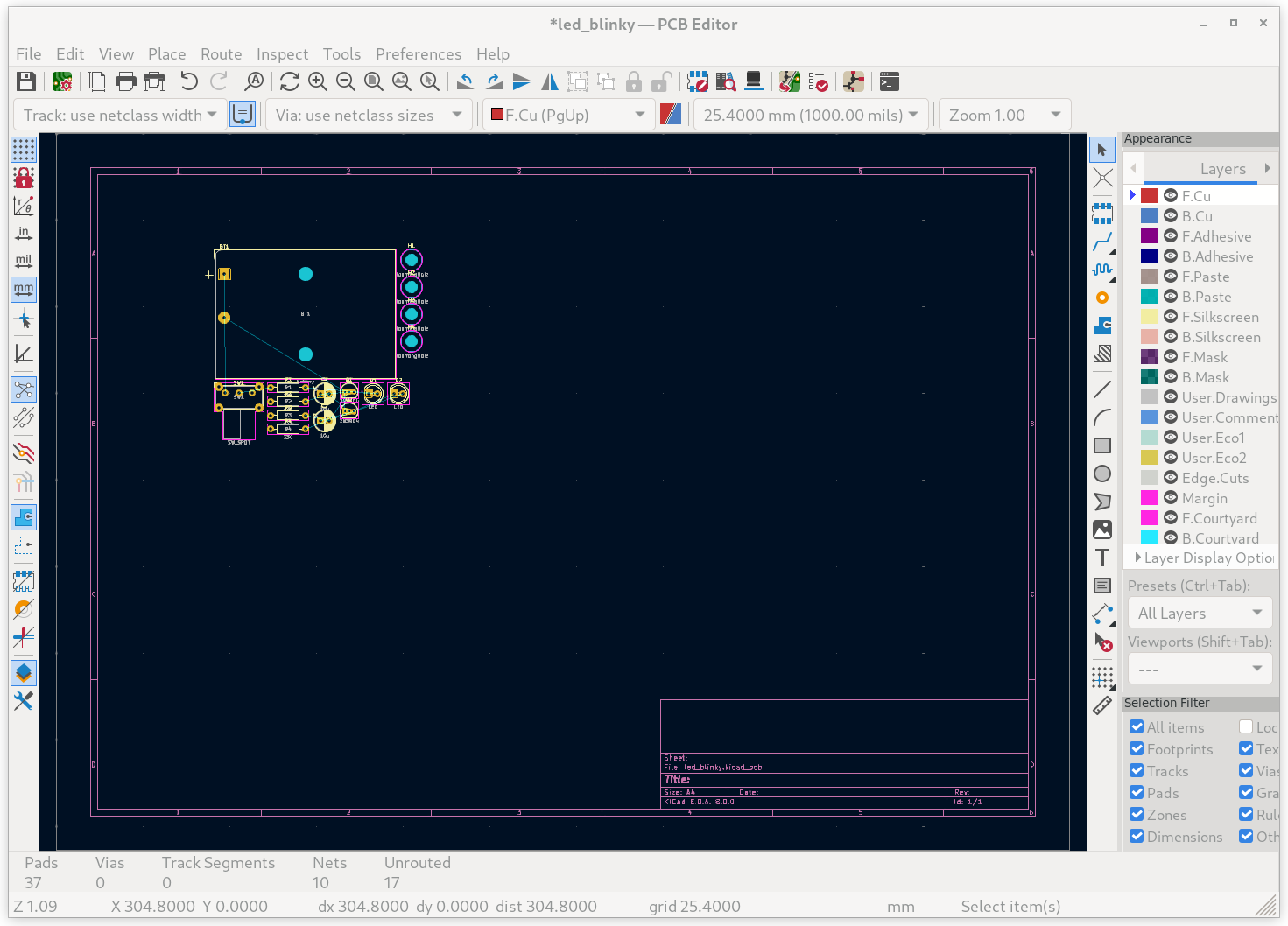 The blue lines connecting the footprints to each other in Figure 13 are called the ratsnest. They indicate where the copper traces need to go to connect the components as per the schematic (netlist). This process is called manual routing when done by the PCB layout designer. Routing can also be done automatically (autorouting) by a computer algorithm, but in many cases the designer will want to route traces manually. To route these traces manually click the Route tracks icon from the left toolbar or use the Shift+x hotkey.