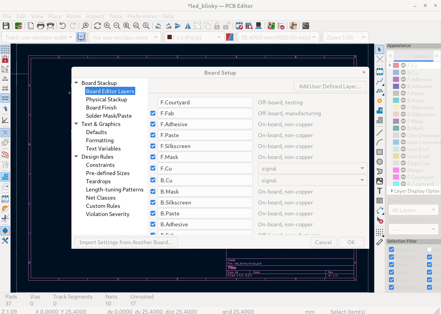 Before proceeding with the layout, let’s have a look at the board setup. The Board Setup dialog can be accessed through the File Menu or green icon with red gear wheel in the top left corner (top toolbar).