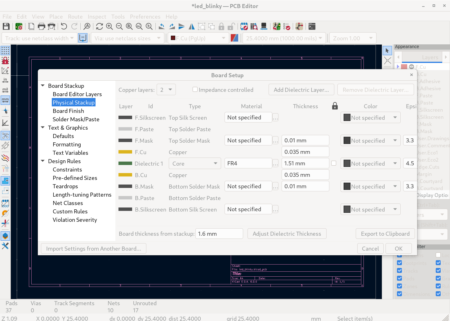 In the Physical Stackup sub dialog we can select the number of layers in the board. Two is the default, and we will leave that as is. You would need to change this value if you want to build a 4-12 layer board.