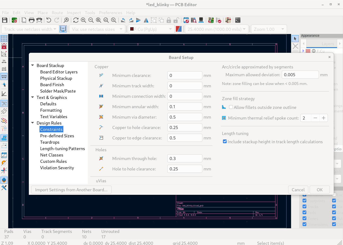 In the constraints sub dialogs we have KiCad’s default design rules. These can be modified to meet PCB manufacturing house requirements. The default rules are adequate for our purposes. So leave them as is for now.
