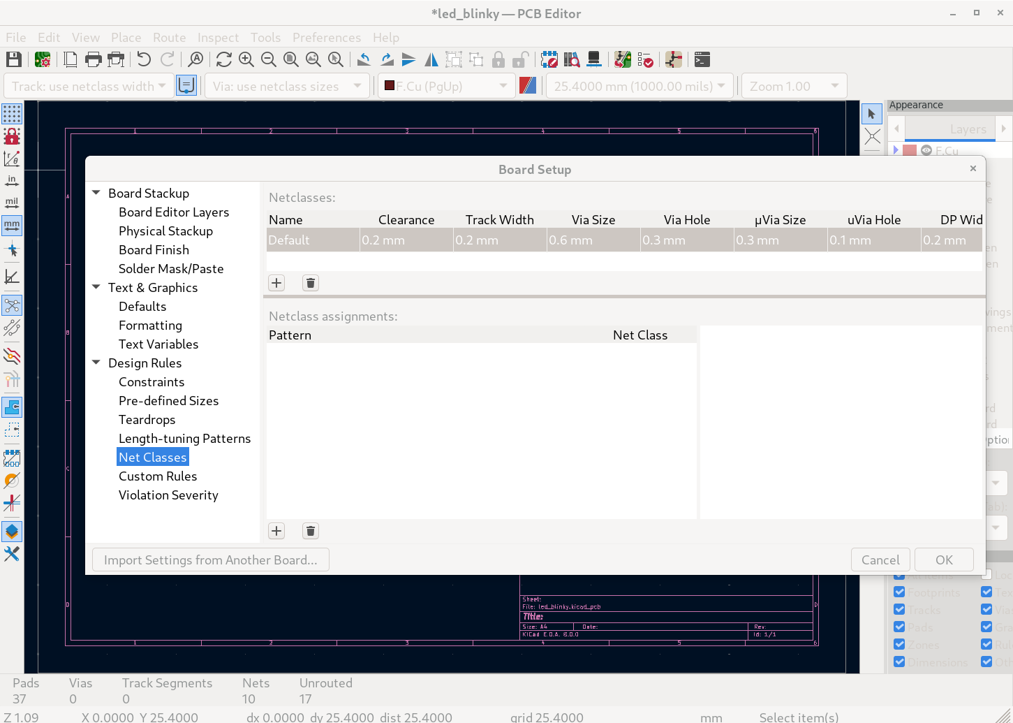 Finally, in the Net Classes sub dialog, we can assign Nets (wires in our design) to Net classes with distinct trace widths. This will come in handy in future designs where we may want to have traces with different widths (to handle different currents; say signal and power net classes) in the same layout.