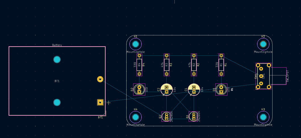 Notice that the ground pins on the transistors and the battery holder are connected directly to the ground copper fills via spokes. These spokes are called ‘thermal reliefs’. It can be hard to get solder to reflow on pads that are directly connected to copper fills because the heat dissipates across the entire copper fill. Thermal reliefs allow us to have our cake and eat it too; i.e.provide a robust electrical connection from the pad to the copper fill, while preventing the heat needed for soldering from dissipating into the copper fill.