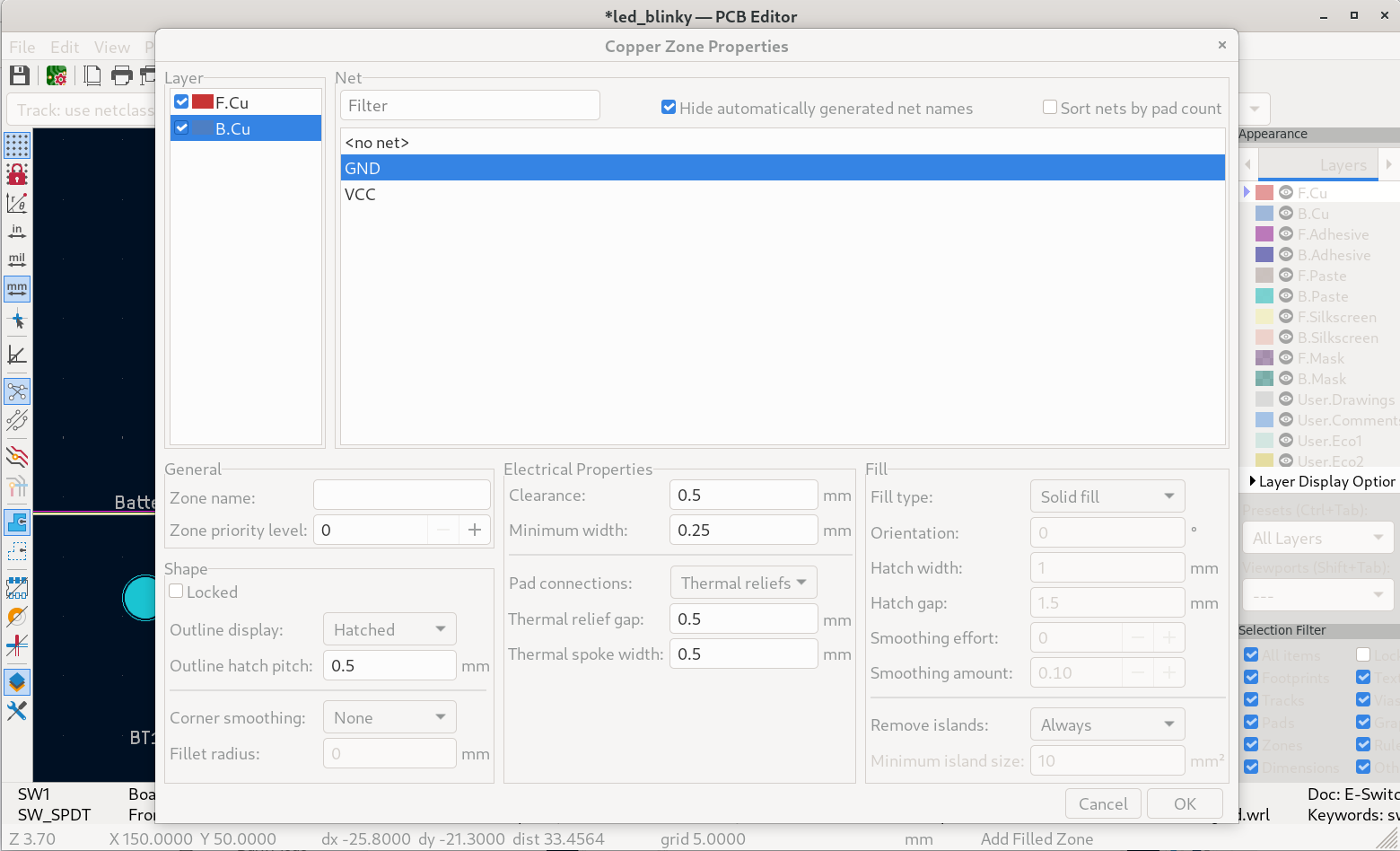 - Place the cursor on the top left corner of the PCB outline and left click the mouse. You will be greeted with a Copper Zone Properties dialog.