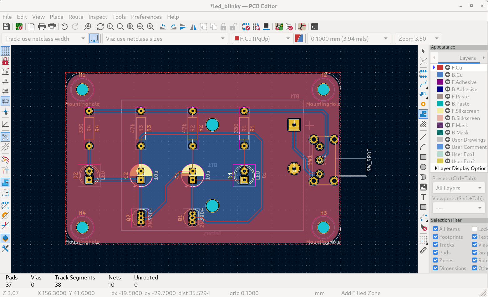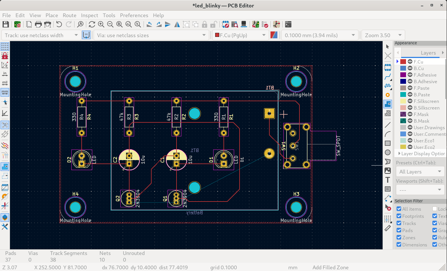 In most 2 layer designs with traces, the goal is to route as many traces as possible on the top layer along with a top ground copper fill that covers the unused areas. Traces are routed on the bottom layer only when necessary, allowing as much as possible of the bottom layer to be utilized as a contiguous ground fill/net. Since our design is relatively simple, we should use only the front (top) layer for trace routing. And assign ground copper fills ( or planes) to both the back (bottom) layer, and the unused portions of the front layer.