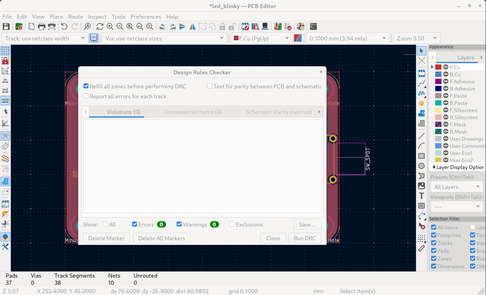 In order to verify that the PCB layout has so far respected the design rules, run a design rule check (DRC). This can be accomplished via Inspect->Design Rule Checker. This opens the DRC Control dialog. Then click on the Run DRC button shown in Figure @fig:18.