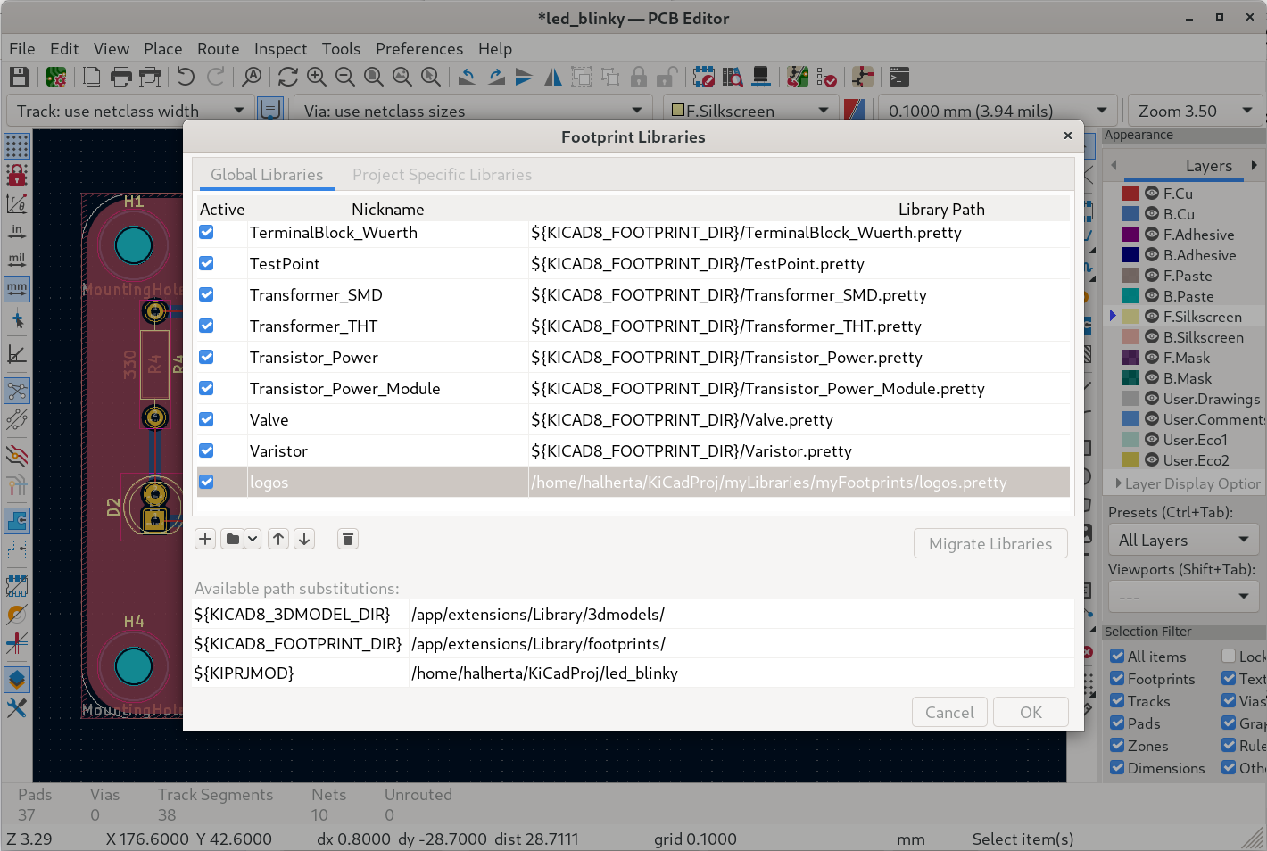 - The logos.pretty is the folder that will contain all custom layout footprints that are logos. Notice that layout footprint collections must be placed into folders with a .pretty extension.