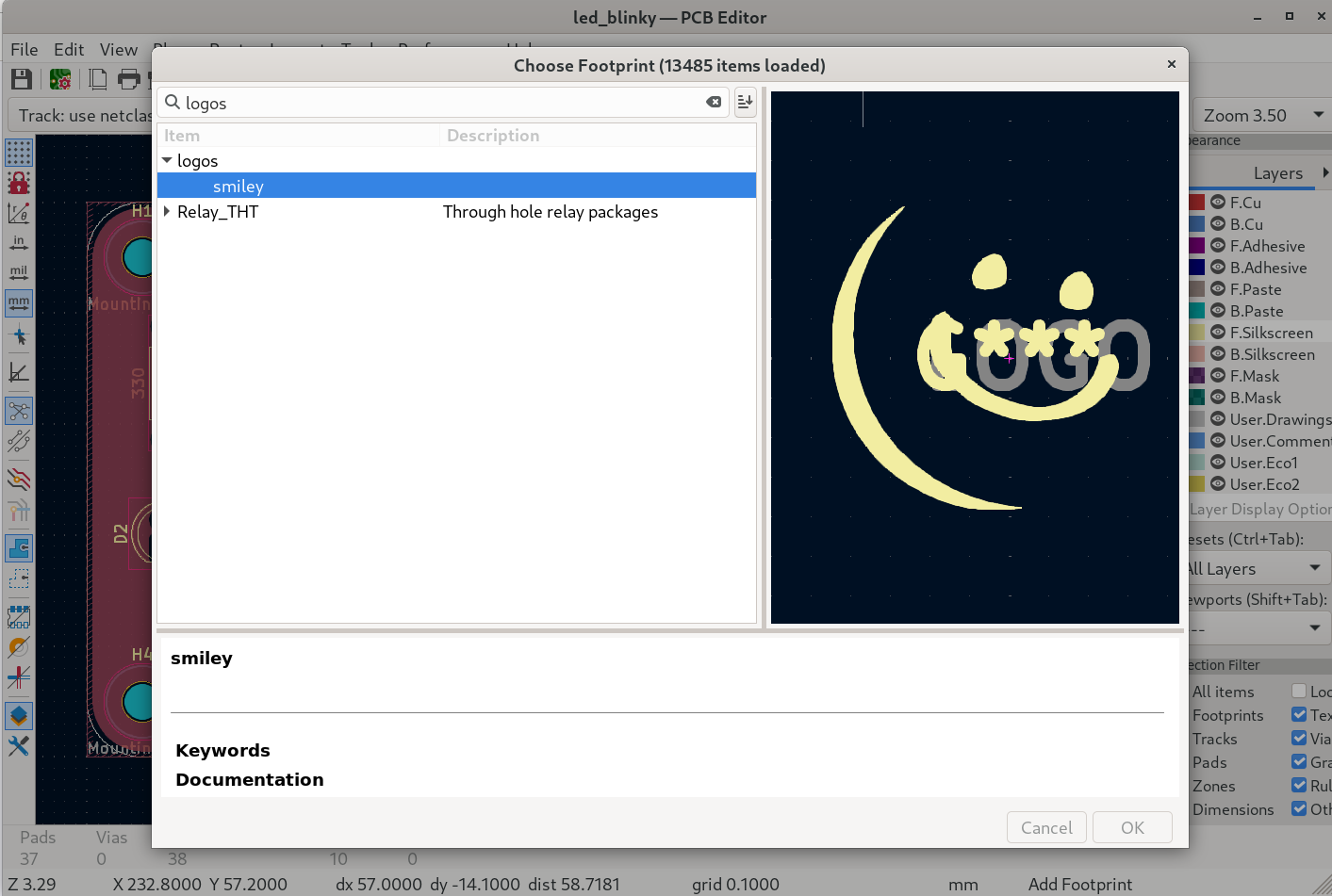 - In this dialog go to the logos library on the left-hand side and double click on the smiley footprint as illustrated in Figure 23.