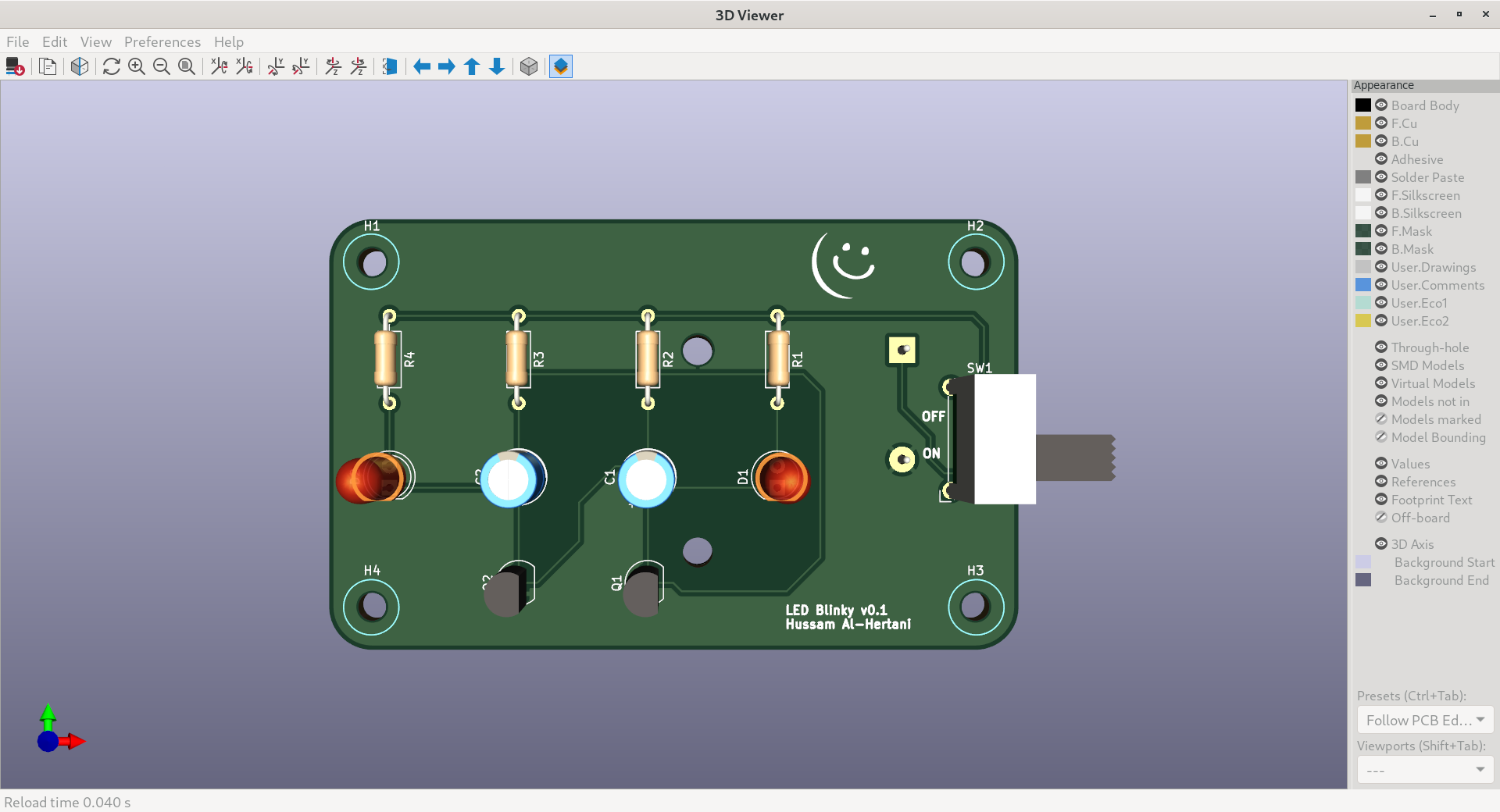 KiCad’s PCB Editor also comes with a 3D viewer. To access it, go to View->3D Viewer. Figure 25 illustrates what the board looks like in the 3D viewer.