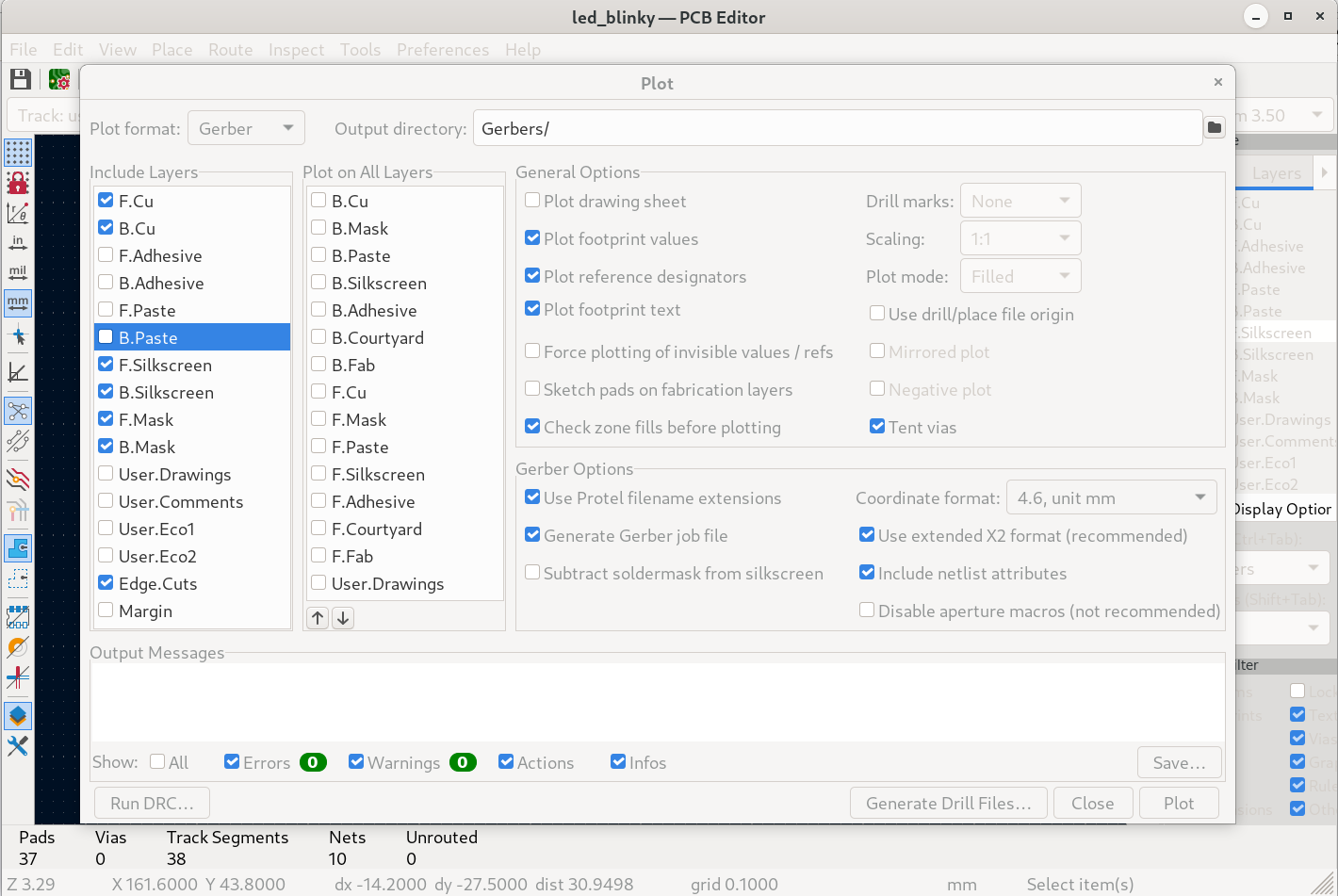 - Set the Output folder to Gerbers and press the Plot button. This will create all the necessary Gerber files (except the drill file) and place them in the Gerbers folder within the project folder.